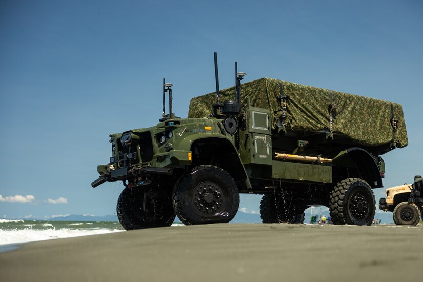 A U.S. Marine Corps Marine Air Defense Integrated System Mk1 assigned to 3rd Littoral Anti-Air Battalion, 3rd Marine Littoral Regiment, 3rd Marine...